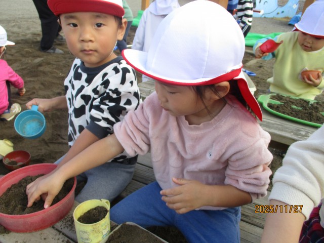 体操・ダンス後は、砂場遊びをしました。友達と一緒にままごと遊びをしたり、大きなシャベルで山を作ったりして楽しみました!また、ままごとではコップに砂を入れて「おかわりです!」「お茶のおかわり、どうぞ!」と配り回る子やお弁当を作って近くにいる保育士や友達に渡して一緒に食べる振りを楽しむ子など様々な姿が見られ、微笑ましかったです♪
