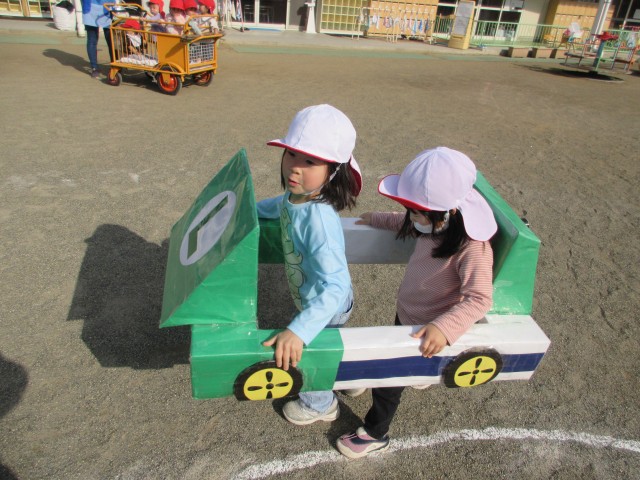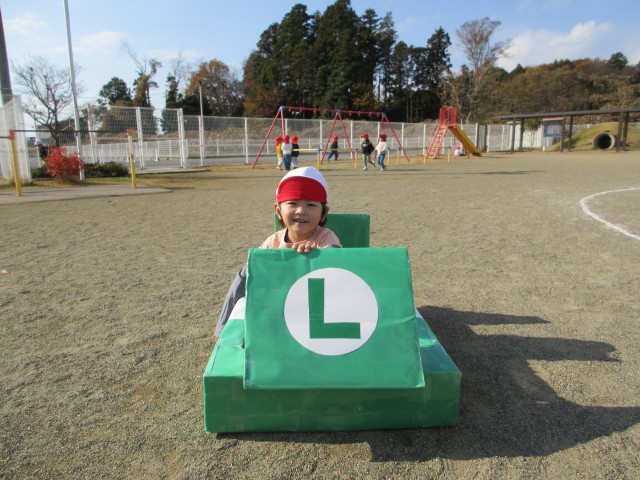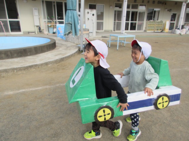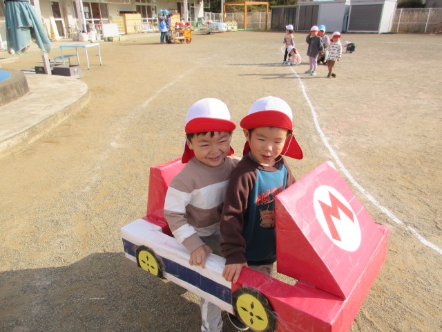 その後、運動会でうめ組が親子競技で使用したマリオカートを借りてレースをしました。二人組のペアで息を合わせながら前に進む姿がとても可愛らしかったです♡