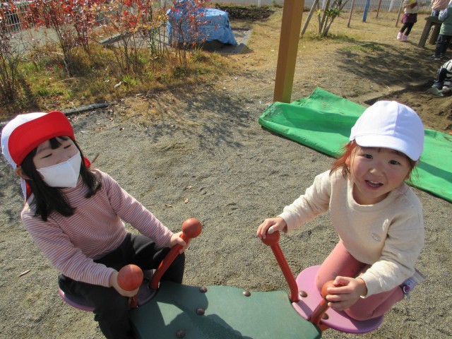 その後は自由遊びをしました。友達を誘い鬼ごっこをしたり、固定遊具を楽しんだりしていました。戸外で伸び伸び体を動かし満足したようで、保育室に戻る際には「沢山遊んだね☆」と嬉しそうに友達と話していました☺