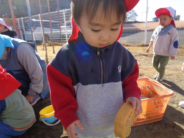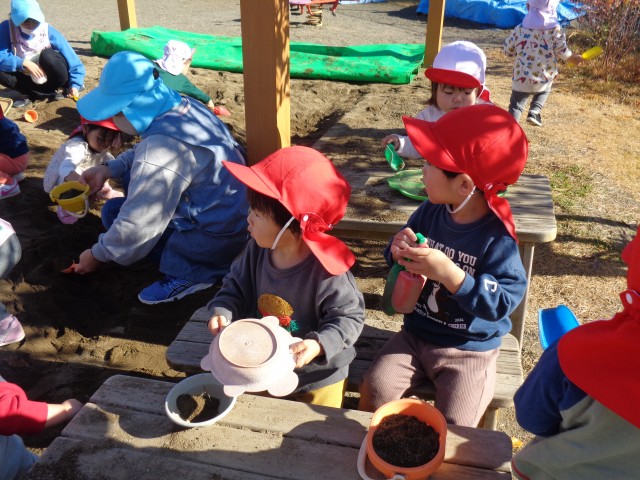 バケツに砂を沢山入れてお友達や保育士にプレゼントしてくれたり、お弁当を作っていたりと、以前よりも遊びに広がりが感じられました♪