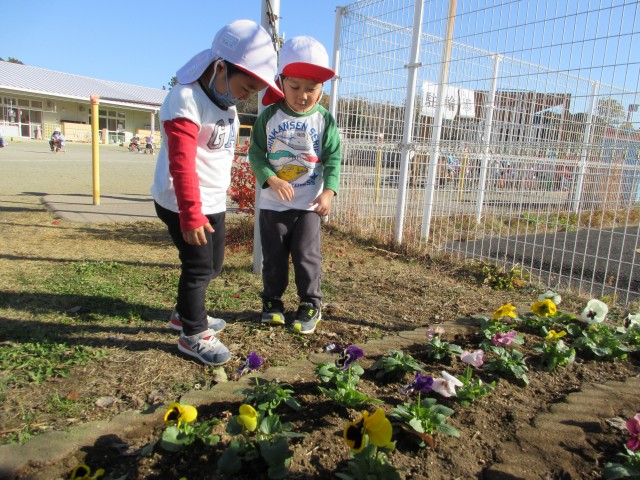 花壇の花が変わっていることに気が付いた子は「可愛いね~」「きれい!」とじっくり観察していました。