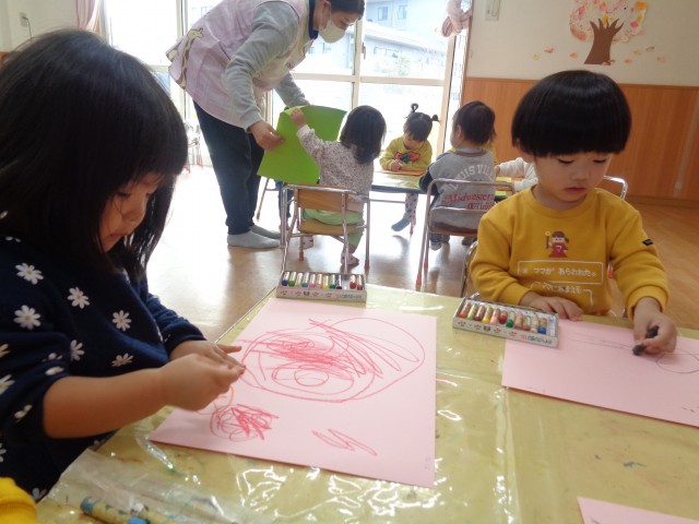 「サンタさんってどんな帽子被ってたっけ?」「これ、アンパンマン」などお話しながら一生懸命描いている姿が微笑ましかったです♪