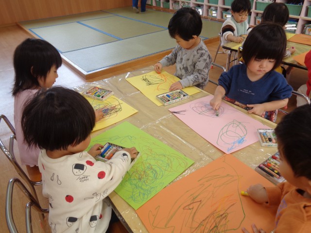 クレヨンを持つ手にも力が入るようになり、力強い線や丸もお手の物!久しぶりのクレヨン画で、皆とても楽しかったようで二枚目の画用紙をもらって絵を描く子もいました♪