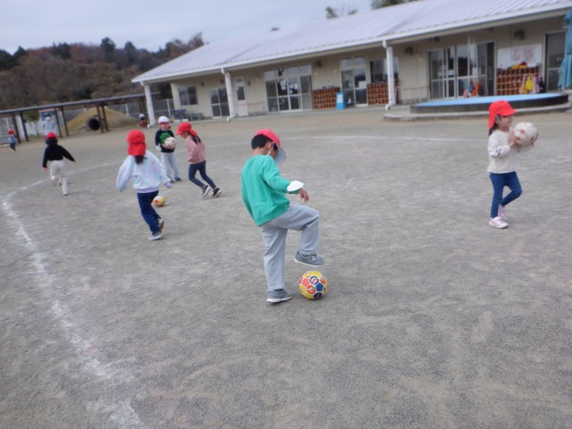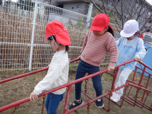 戸外に行くと、沢山走って元気いっぱいの子どもたちです。ボールを用意すると、「やっていい?」と友達を誘って蹴り合うことを楽しんでいました。固定遊具のすべり台や赤い吊り橋が人気でした。