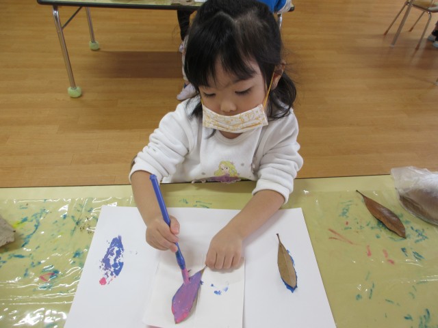 保育室に戻ったら集めてきた落ち葉に絵の具を塗り、さっそくスタンプに挑戦!