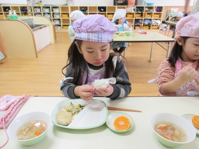 自分で作ったおにぎりを嬉しそうに大きな口で食べていました♪