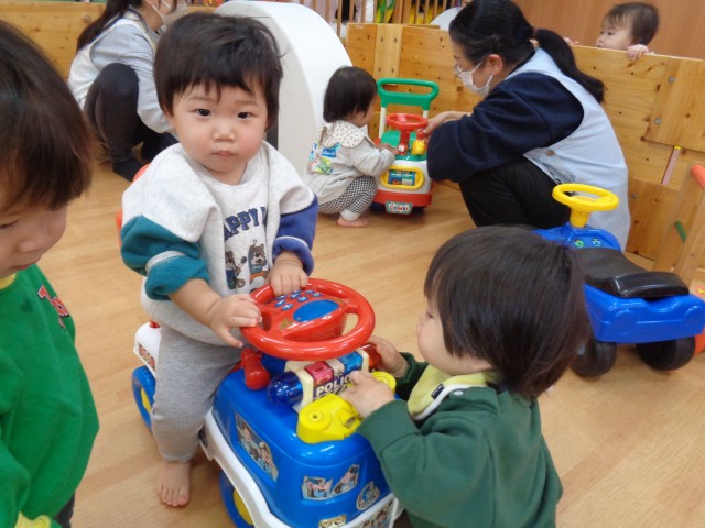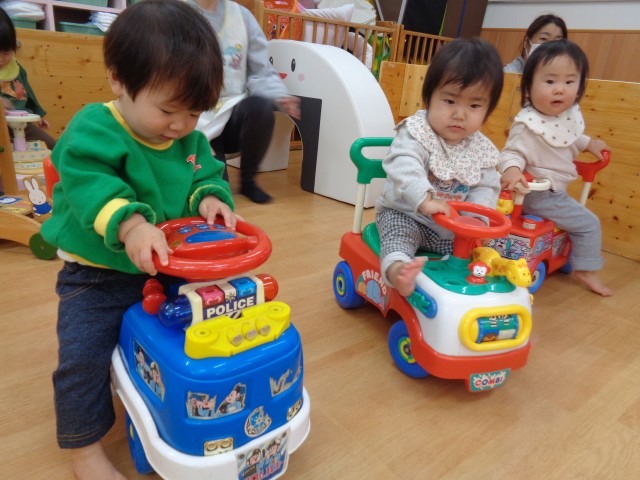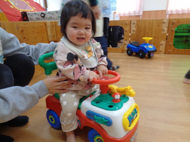 その後はマラソンを行い、三輪車や缶ぽっくり、フラフープで遊びました。缶ぽっくりでは、少し難しそうにする友達に「こうやるんだよ」と優しく教えてあげる姿が微笑ましかったです♪