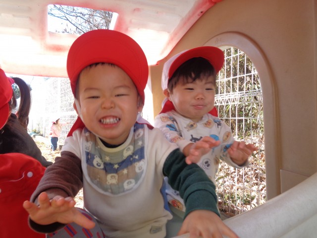 頂上まで登ると、下にいる友達や保育士、さらに空に向かって「おーい!」「やっほー!」と手を振っていました☆とても微笑ましかったです♪築山の他にも、お家に入ったり、フェンスに沿って歩いたり、思い思いに楽しんでいました♪