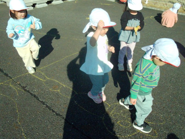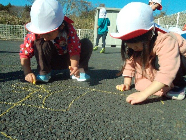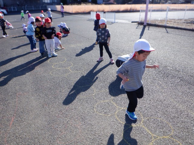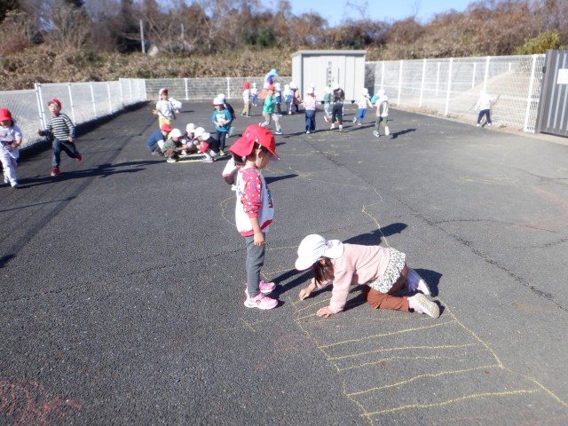 「うさぎケンケンパ、描いたよ~!」と楽しんでいたゆり組。たんぽぽ組は、丸を描き、みんなでケンケンパをして楽しみました。