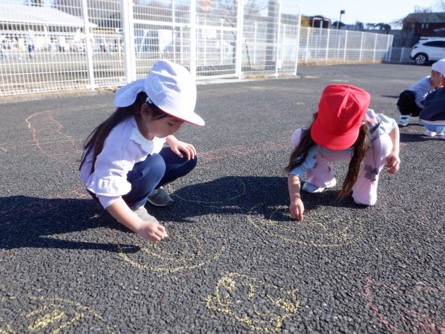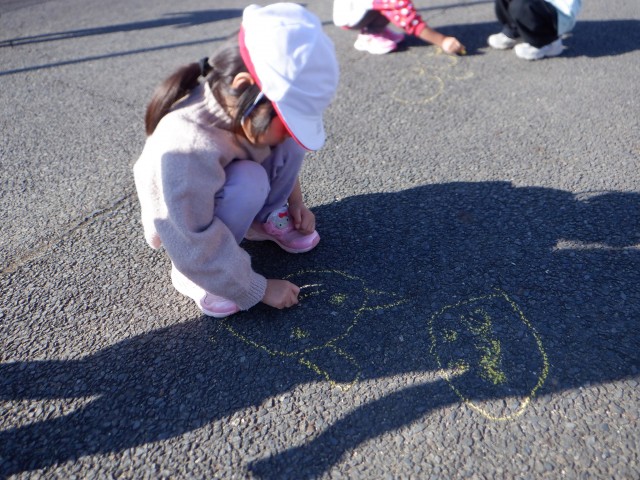 今日は駐車場に行って、一緒にチョーク画をしました。