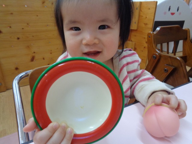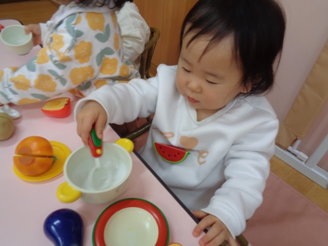 テーブルを囲んでままごと遊びをする子や保育士に「どうぞ」と作ったものを渡している子がいましたよ♪