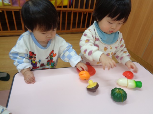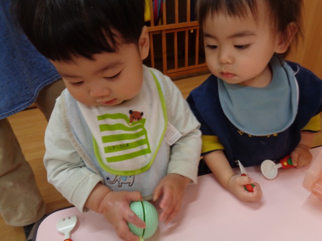 今日は“汽車の遊具”と“ままごと”です。どちらの遊びも行ったり来たりしながら楽しんでいました。