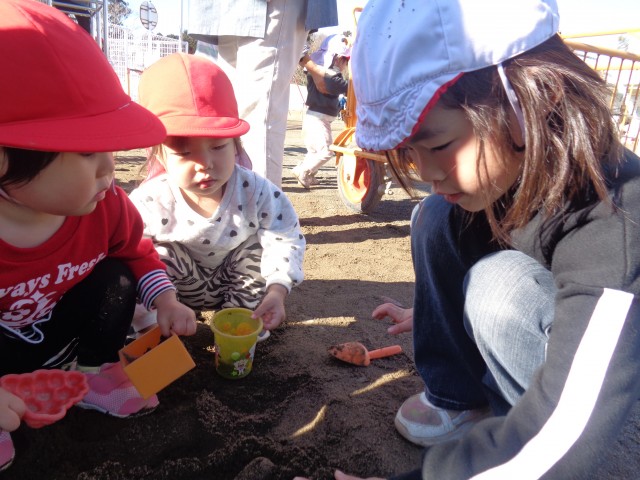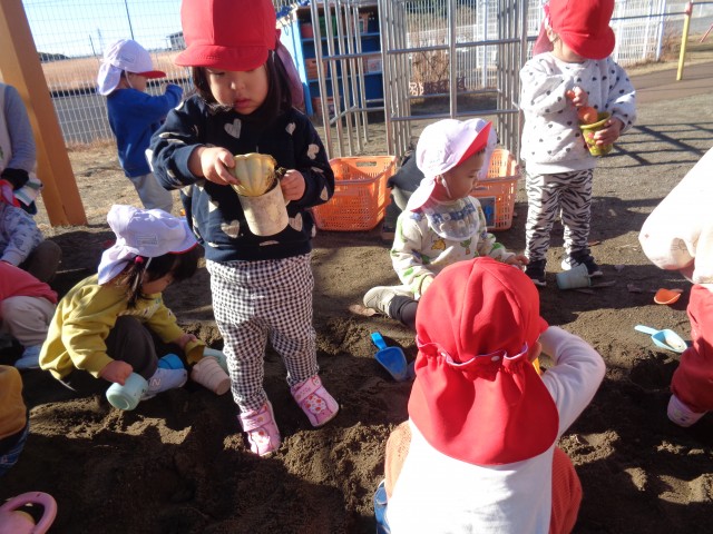砂場遊びでは、砂をさわったりままごと遊びをしたりして楽しみました。