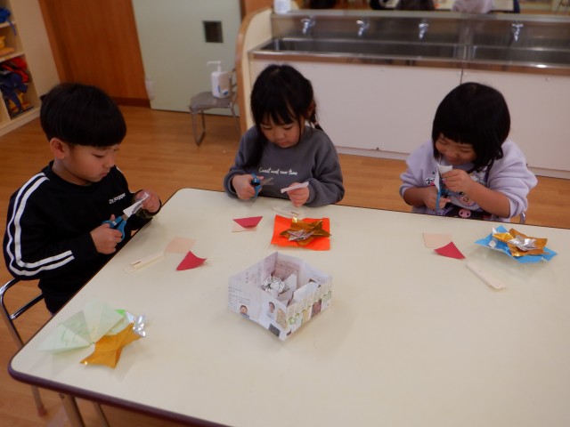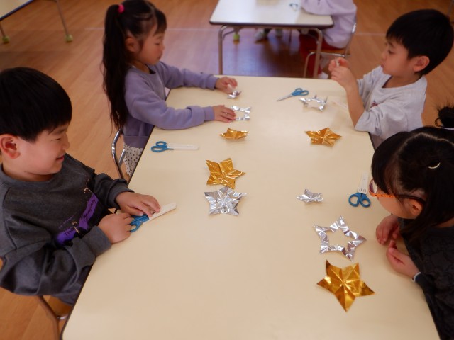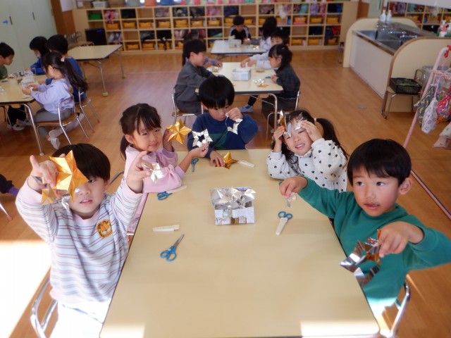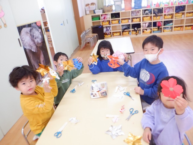 折り紙を切って広げて、星が出来ると子どもたちの顔の表情がにやけてきたり、自然と「うわぁ~」と声が漏れてきたりと…嬉しそうでした。