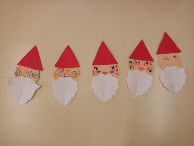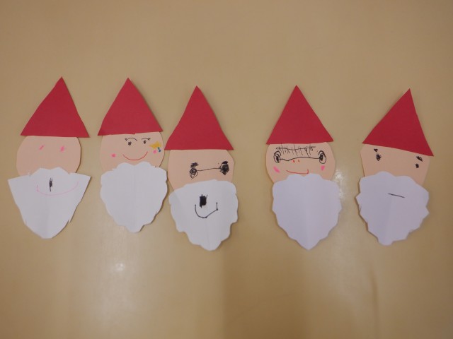 先日クリスマスツリーの装飾作りをした際、上手にハサミで丸を切ることが出来たので今日は大きさの違う二つの丸を切って”雪だるま”製作をしました。