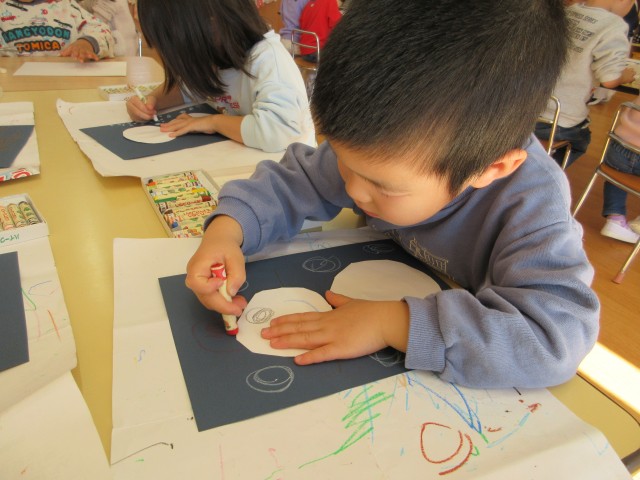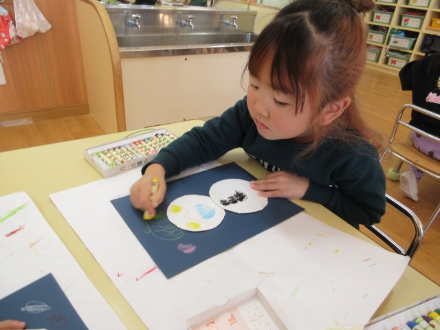 広がって出来た模様に自分たちで「これは花だよ!」「これは星の仲間!」等、切った模様の説明をしていました。