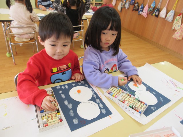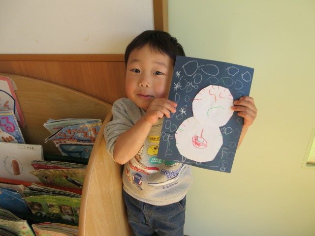 丸をのりで画用紙に貼り、顔や帽子、腕、雪等をクレヨンで描くと…
