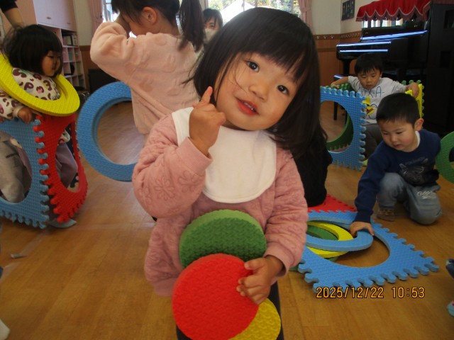 プラポイントで遊びました。同じ形を集めて楽しんでいました。カメラを向けると、可愛らしくポーズを決めてくれました♪