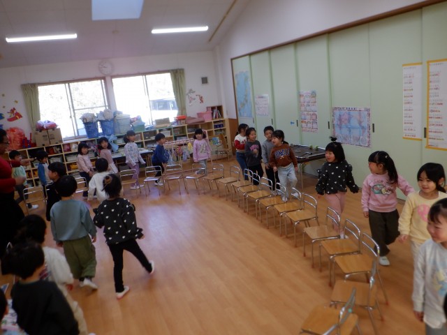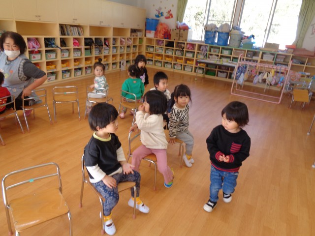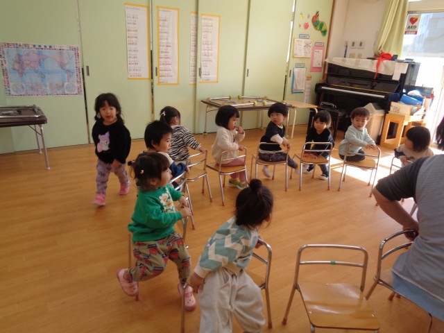 月齢の高い子たちは、椅子取りゲームをしました!以前遊んだことがあるからか、皆「覚えてる!」と言ってどこか嬉しそうな様子でした♪音楽に合わせて歩きながらも、音楽が止まった瞬間を聞き逃さないよう一生懸命聞いている様子がとても可愛らしかったです。