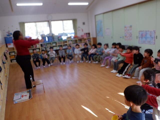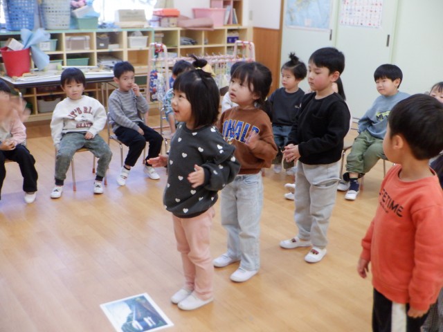 先生の真似をして1月ならではの「凧」「コマ」の単語を発音したり、「バス」「ロケット」「電車」などの乗り物の単語を発音し、好きな所に並んで順番に発音したり、体を動かして遊んだりして楽しんでいました。