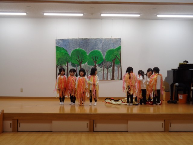 たんぽぽ組、うめ組の劇を見学させてもらい、子どもたちも興味津々。中には「ねえねいた!」と嬉しそうに指を差して教えてくれる子もいました。静かに見ながらも、一緒に飛ぶ真似をしたり、ピアノが流れている最中体を左右に揺らしたりと、楽しんでいました♪