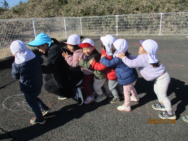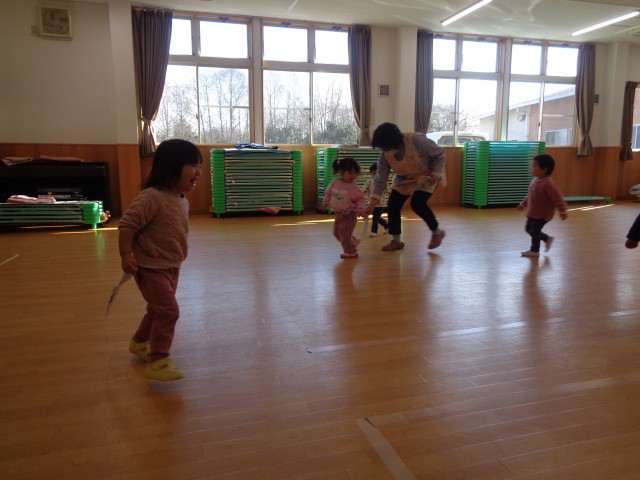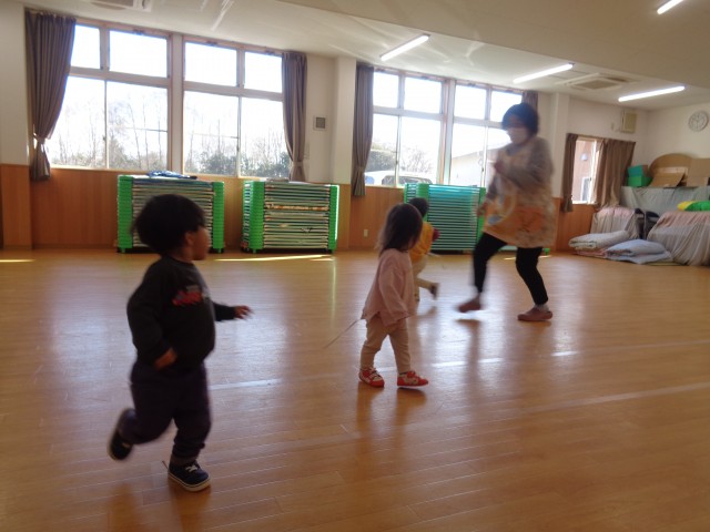 しっぽ取りゲームをしました。保育士が追いかけると、「キャー」と言いながら逃げていました。なかなか、しっぽが取れない保育士でした。