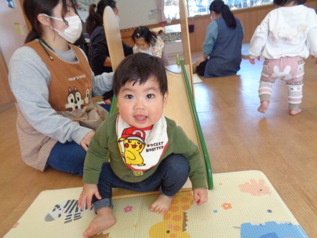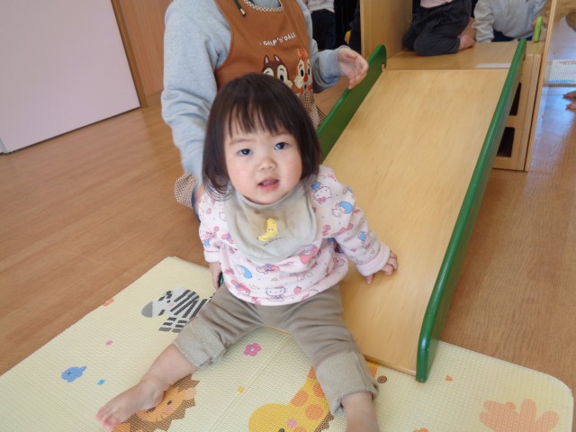 月齢の低い子は、さくら組の保育室で室内滑り台を使って遊びました☺