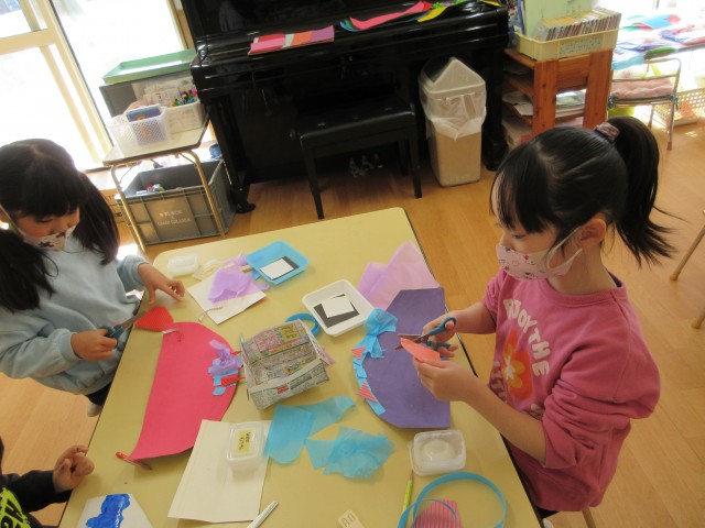 紙テープを髪の毛や口にしたり、毛糸をまとめて貼り髪の毛にしたり。花紙でリボンを作って髪飾りをつけたりと沢山の面白いアイディアが出ていました♪