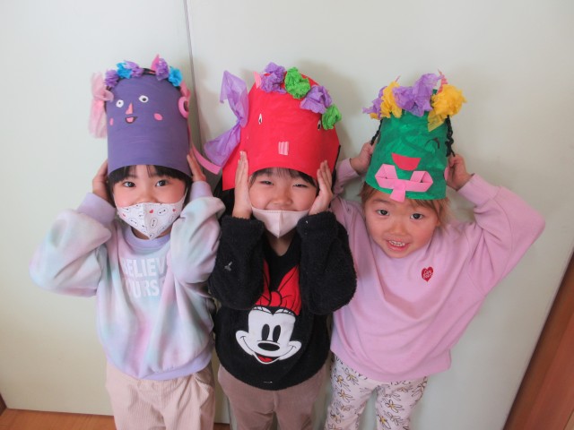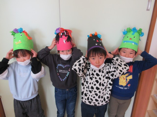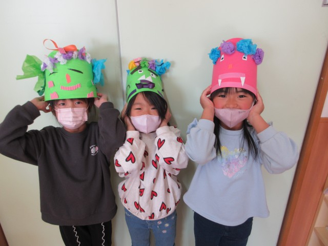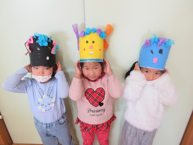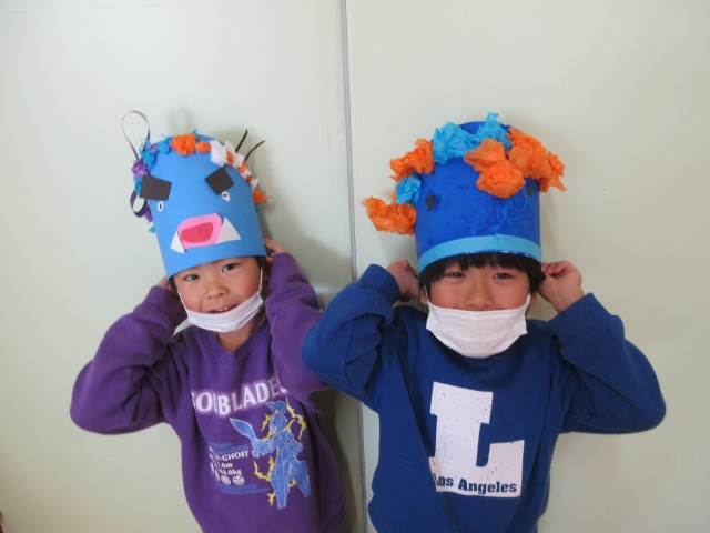 目にまつ毛を付けたり、画用紙を細く切ってにっこりの口を作ったり。鬼の表情にもこだわっていました♪