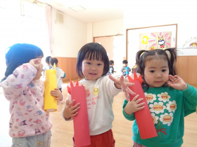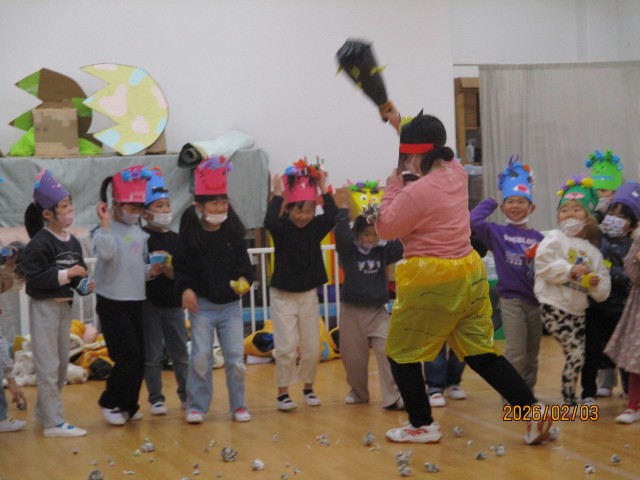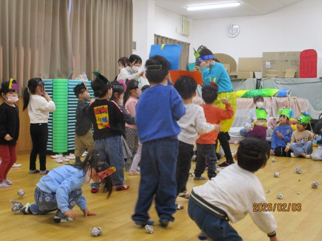 鬼が怖くて泣いてしまう子もいましたが、近くにいる保育士と一緒に投げようとする姿や鬼を怖がることなく、立ち向かう勇敢な姿も見られ、感動しました!