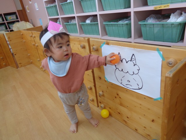 つい立てにいた鬼さんにボールを投げて鬼退治をしました。