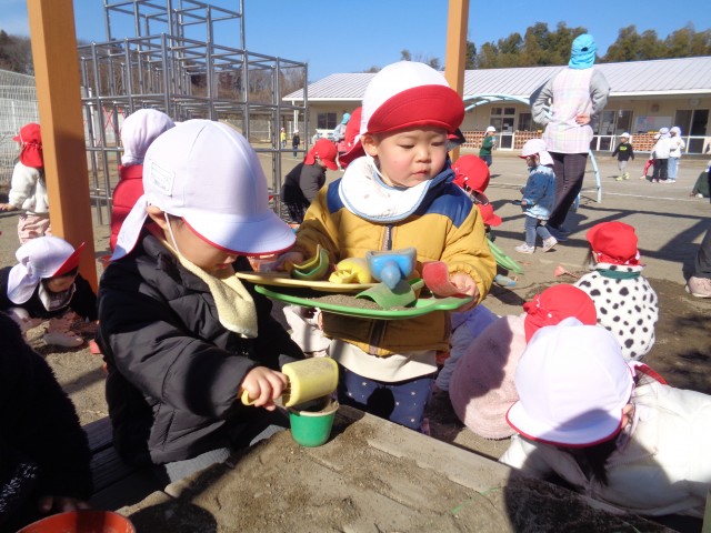 「お弁当どうぞ!」「葉っぱあった」「○○ちゃん、飛行機見えるよ!」と保育士や友達と会話をしながら砂場遊びを楽しんでいて、微笑ましかったです☺