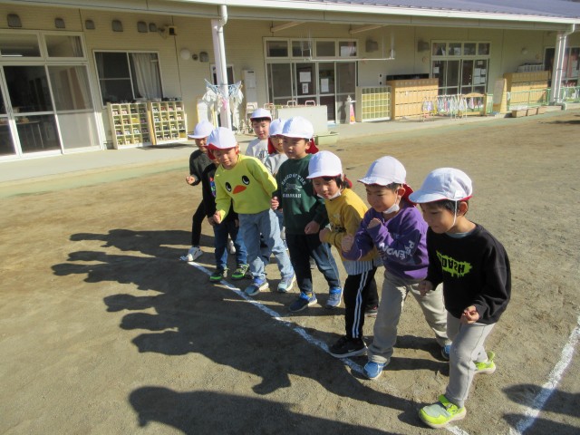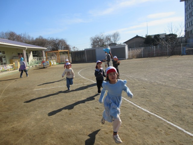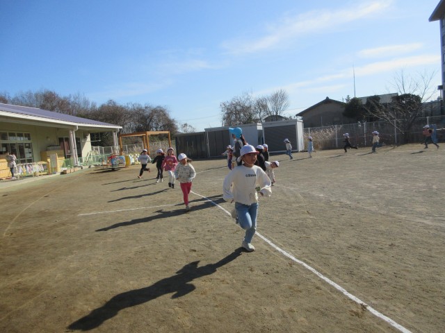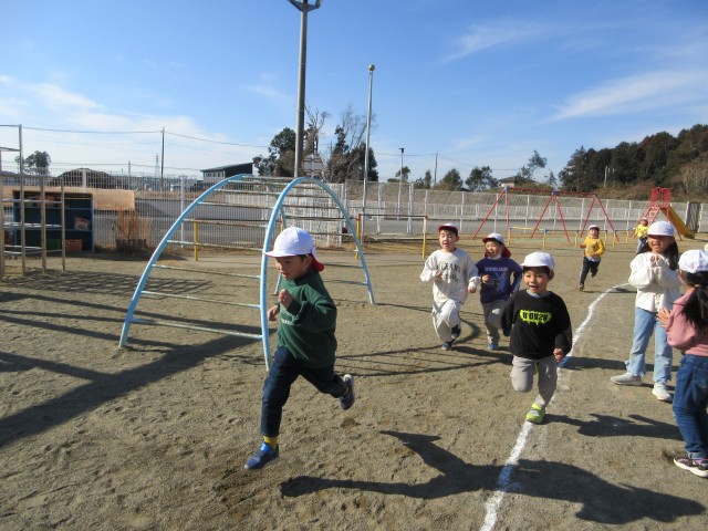 始めに準備体操をしてマラソンをしました。「1・2・3・4・・・」と大きな声を出して張り切っていました。少しずつ自分のマラソンのペースを分かってきたようで最後のラストスパートまで頑張って走っていました。
