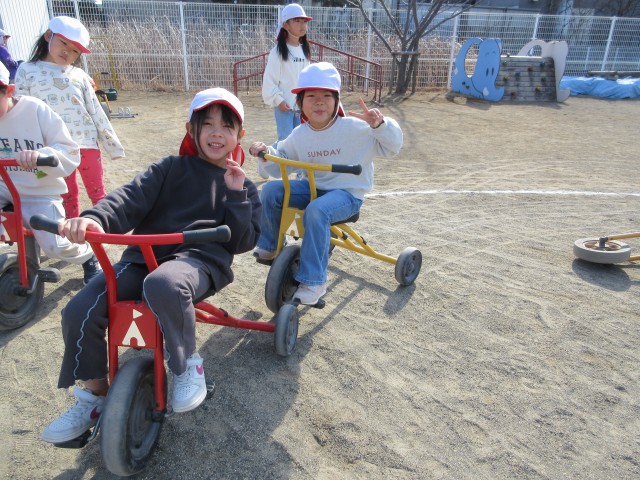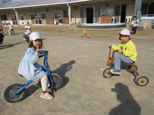得意気に二輪車に乗る子や「練習する!」と意気込んで二輪車を頑張る子、友達と並走しながら三輪車を楽しむ子…などそれぞれ満喫していました。