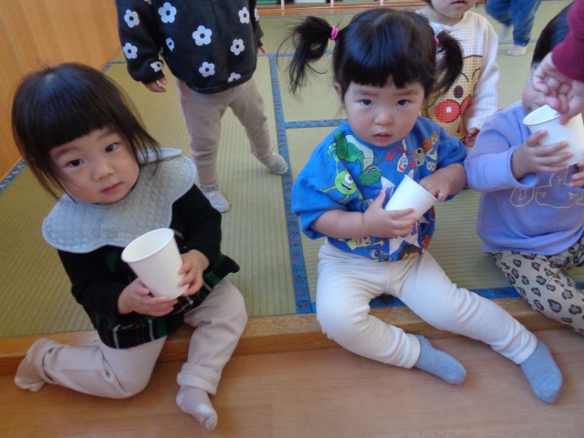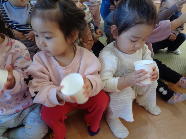 「ツルツルしてるね♪」と保育士の言葉を繰り返す子や飲む振りをしている子がいて、とても可愛らしかったです☺