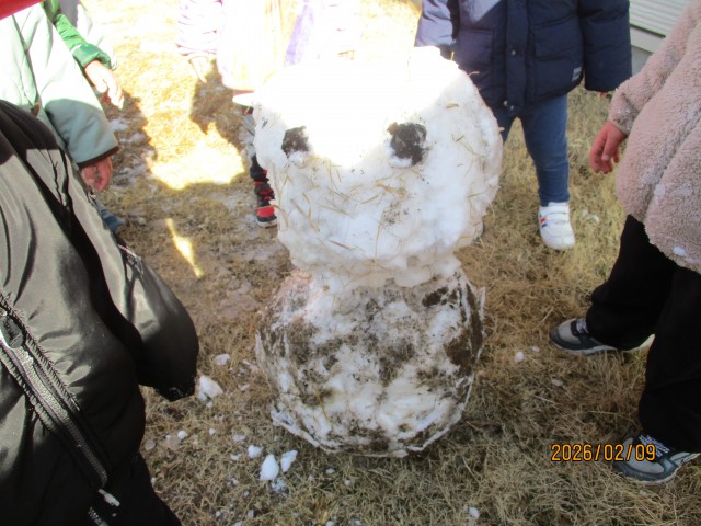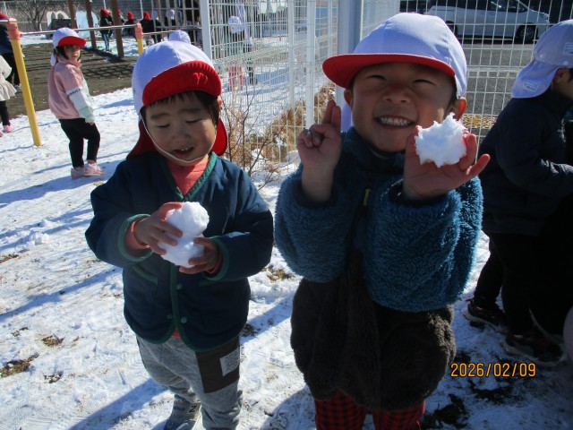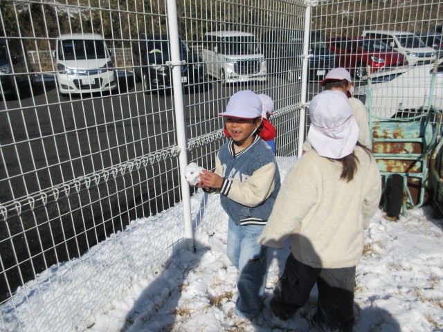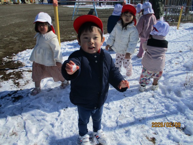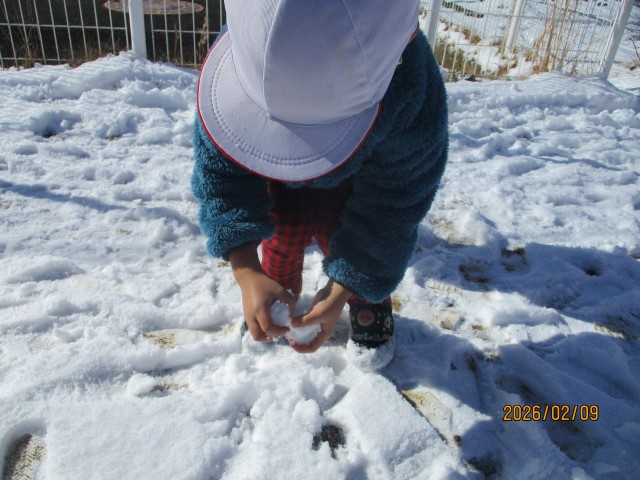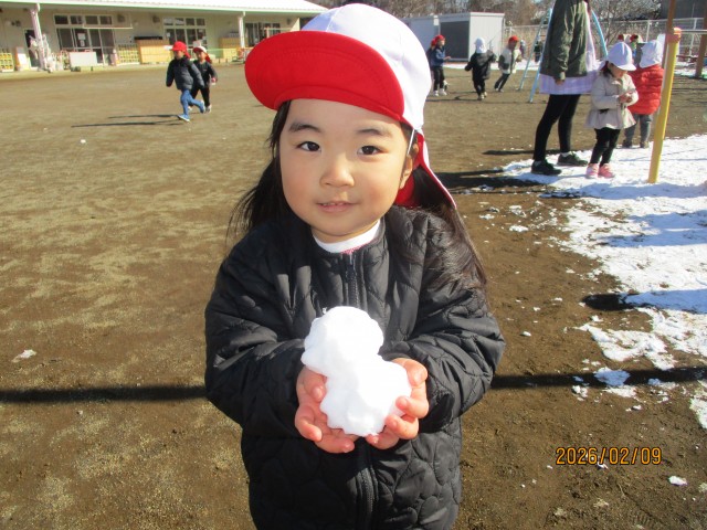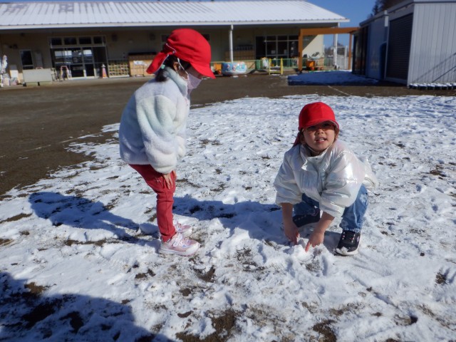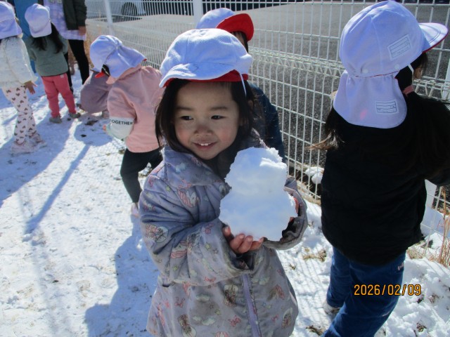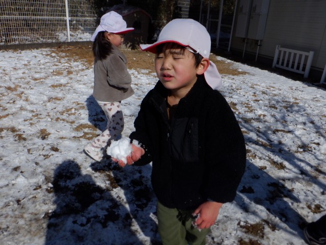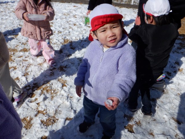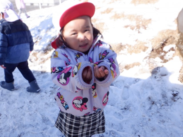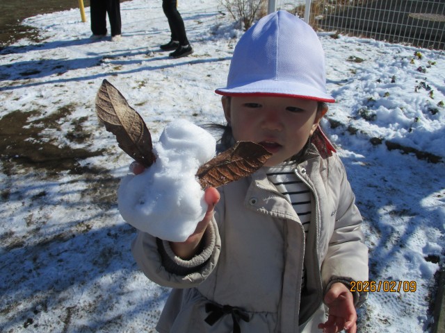 雪だるまを作り嬉しそうに持って見せてくれました。「お家でも作ったの!」と昨日家で雪遊びをしたことも嬉しそうに話してくれました♪