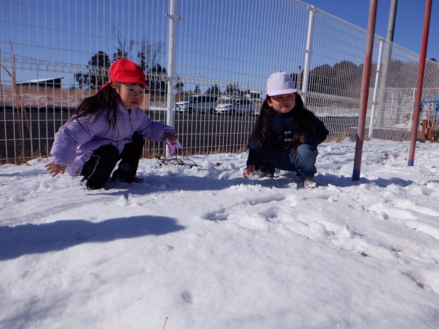 外に出るとすぐに雪の所に駆け寄り、「冷たーーい!!」「ふわふわだよ~」と嬉しそうに話したり雪を見せあったりしていました♪
