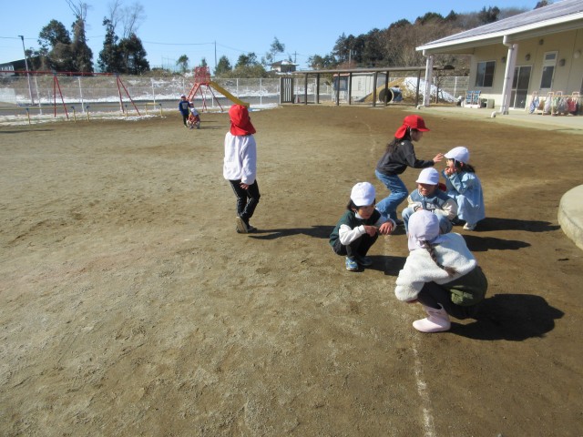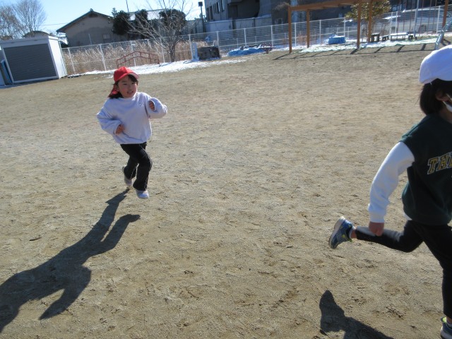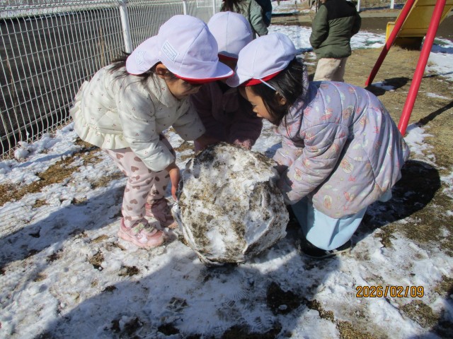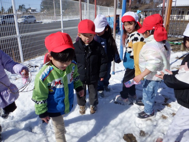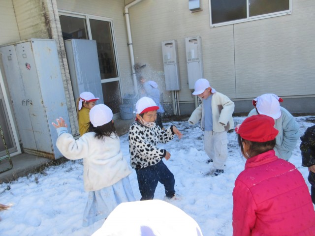 園庭の雪は溶け始めていたので職員駐車場の方から中庭に行って雪遊びをしました。「雪合戦したい!」「先生当てて良い?」と雪遊びを楽しむ子どもたち。手が冷たくなり「しもやけになっちゃった。」と話す子も…。その後は園庭に戻って皆で電子レンジ鬼をして体を温めました。自由遊びになるとまた雪遊びを再開する子も沢山いました☺