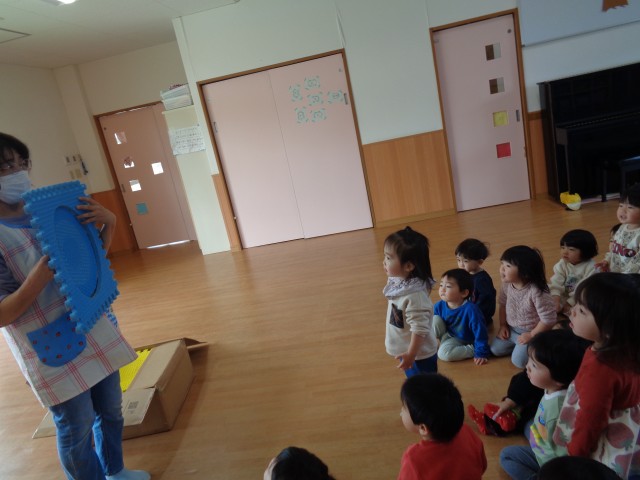 何色か子どもたちに尋ねると、「赤!」「緑!」と口々に言っていました。色クイズはすっかりお手の物!のさくら組の子どもたちでしたが、「なんの形?」と尋ねると、固まってしまう子が多くいました☆何回か聞いていくうちに、四角、丸、の形を覚える事が出来ました♪