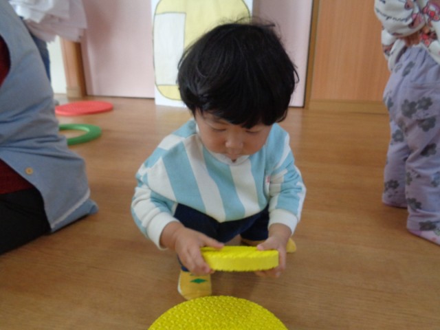 お家を作ったり、小さい丸を沢山集めたり、思い思いに楽しんでいました。輪っかを沢山持ってきて、首にかけると、「おもいよ~」と言ってニコニコ楽しそうにしていました!