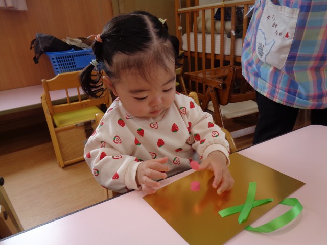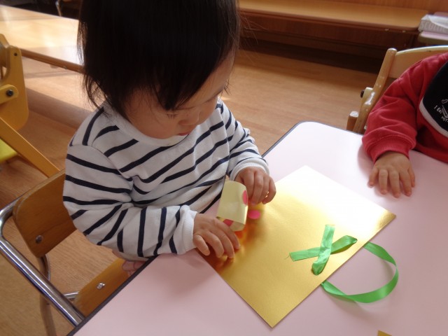 自分たちの手でのりつけてパーツを貼るのは今回で2回目でしたが、最初に使う指だったり約束を確認したりすると、「お兄さん指だよね!」「いっぱいのり取ったらダメ!」などと覚えている子がたくさんいました♪