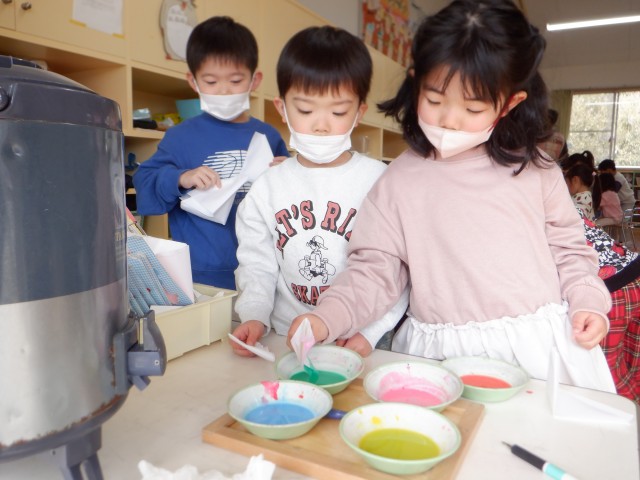 ひなまつりの製作をしました。障子紙を折って、染め紙をしました。障子紙は三角形に折った物に、角に色を付けました。広げてみると、「すごい」「かわいい」と嬉しそうな子どもたちでした。