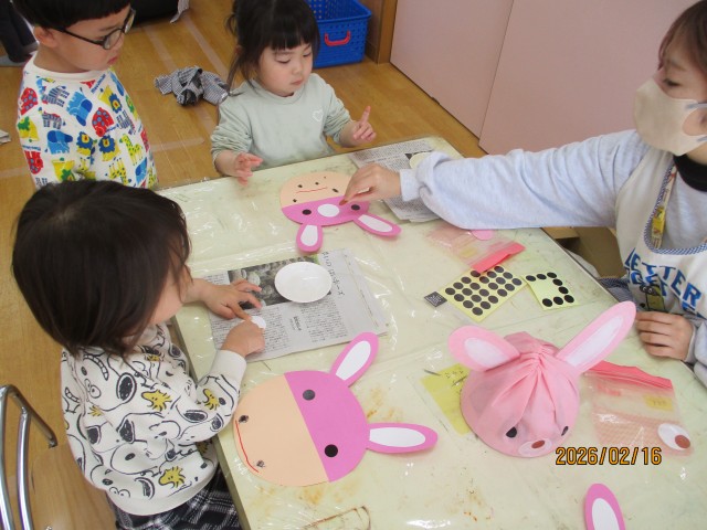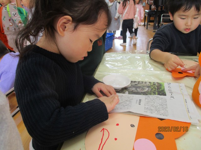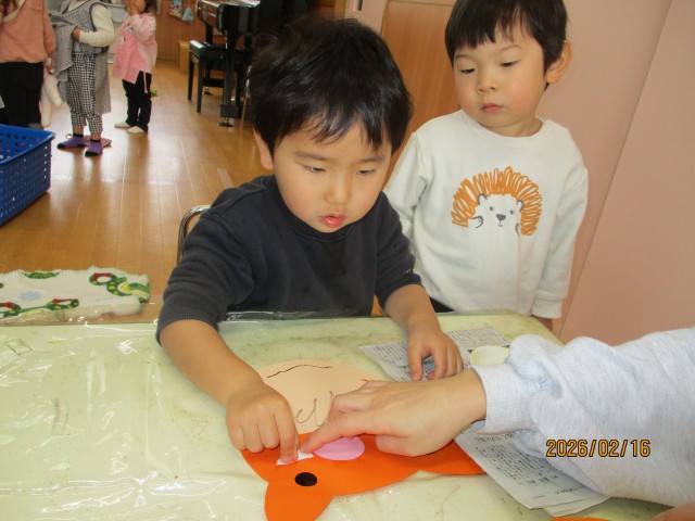 発表会の劇で行なったそれぞれの役の動物のパーツ貼りをしたりひげを描いたりしました。順番に「カエルさ~ん♪」などと役ごとに呼ぶとすぐにかけつけ、集中してパーツ貼りに取り組んでいました♪