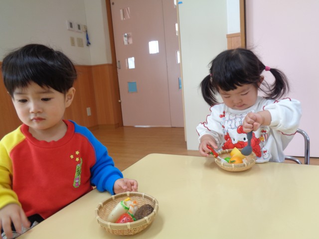 待っている間は、おままごとをして遊びました。美味しそうなハンバーガーやプリンなどを、フォークやスプーンを使って食べる真似をして、とても楽しそうでした♪包丁を持っている子は、使い方をよく知っていて、「よいしょ、よいしょ」と言いながら一生懸命料理をしていてとても可愛らしかったです☆お家での様子をよく見ているのでしょうか?