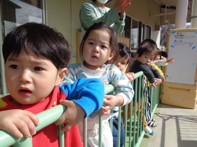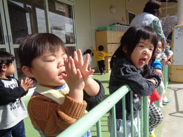 保育室で遊んでいると外から楽しそうな声が聞こえてきたので、テラスに出て3歳以上児のお兄さん、お姉さんのマラソンの応援をしました。「がんばれー!」「ファイト―!」と子どもたちなりに一生懸命応援していました☆