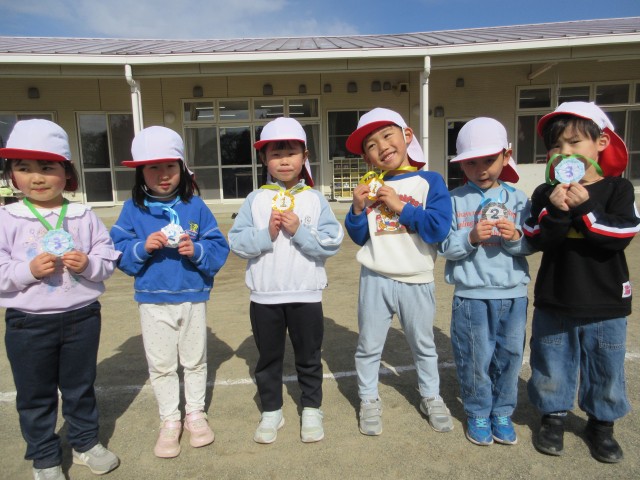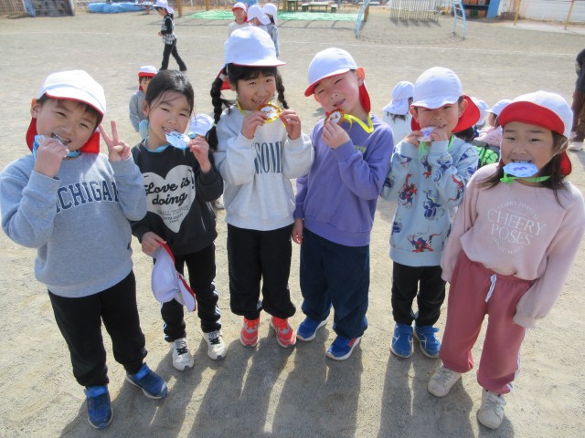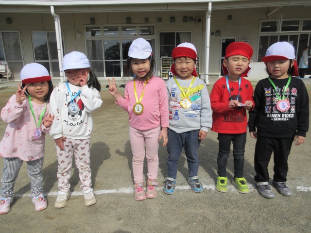 うめ組のメダル受賞者は、「オリンピックみたいにメダル食べる振りしていい?写真撮って!」と嬉しそうに記念撮影をしていました☺すみれ保育園うめ組代表の子どもたちです☆未来のオリンピック選手がこの中から現れるかも?!