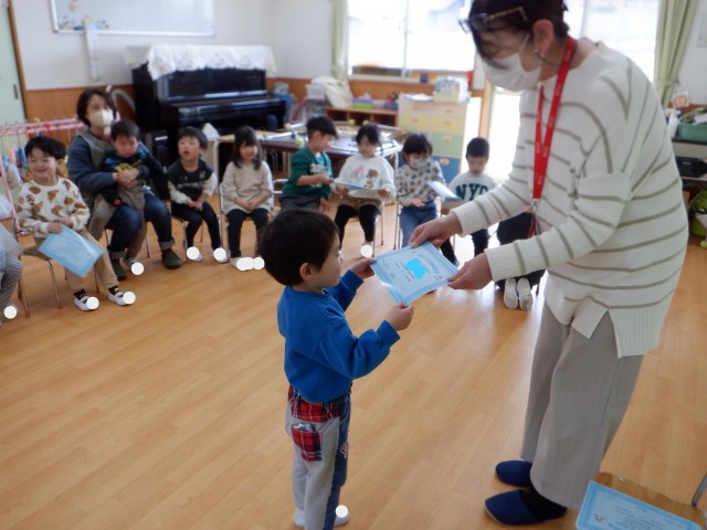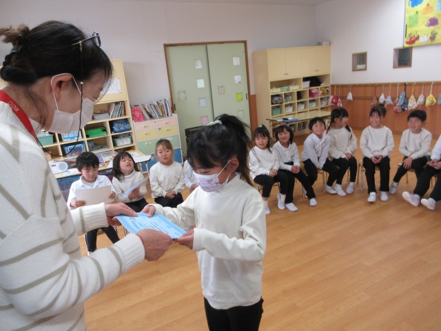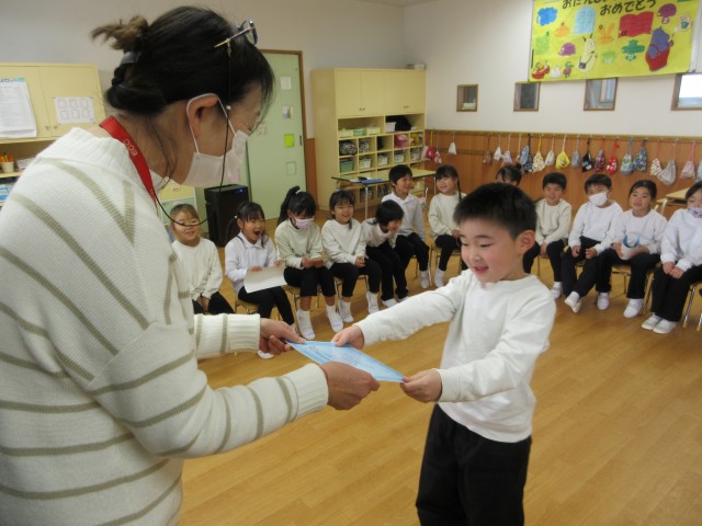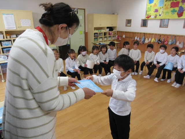 いつもと違う英語での名前(呼名)に不思議そうな表情をしている子もいましたが、証書をてにするとみんな嬉しそうにしていました。