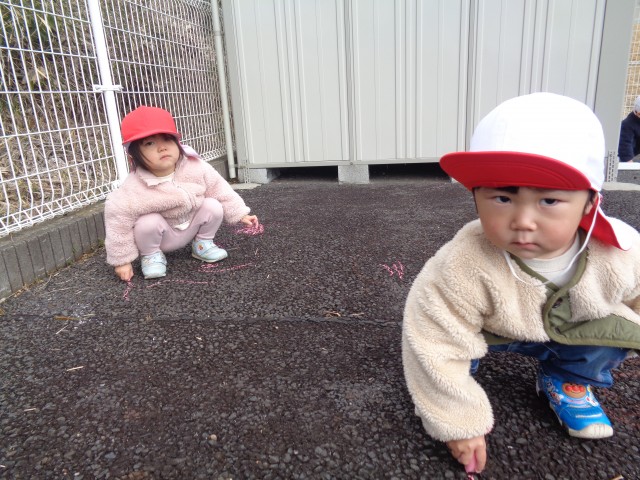 チョークを子どもたちに見せると、「ピンクがいい!」「黄色!」など自分の好きな色のチョークをリクエストしている子が多くいました。チョークを受け取ると、地面に丸や線を描いて思い思いに楽しみました。