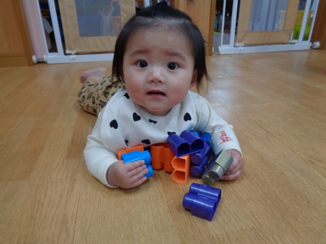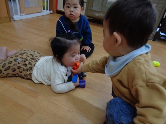 月齢の小さなお友達にブロックを「はい!」と渡してあげている様子が見られました。