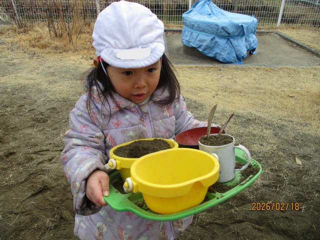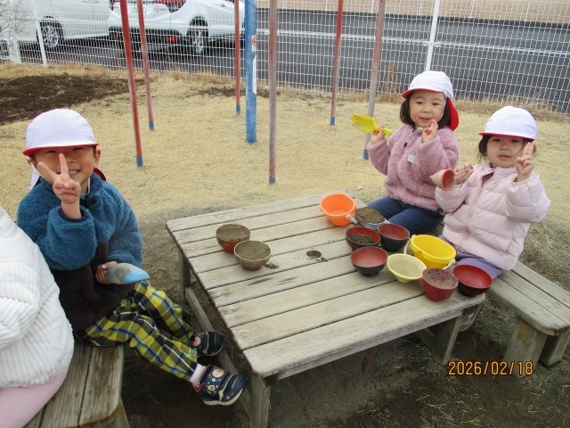 砂場について、すぐに机に皿を並べ、「今日はピクニックに行くからお弁当作ってるの~♪」と楽しそうにお友達と作っていました。